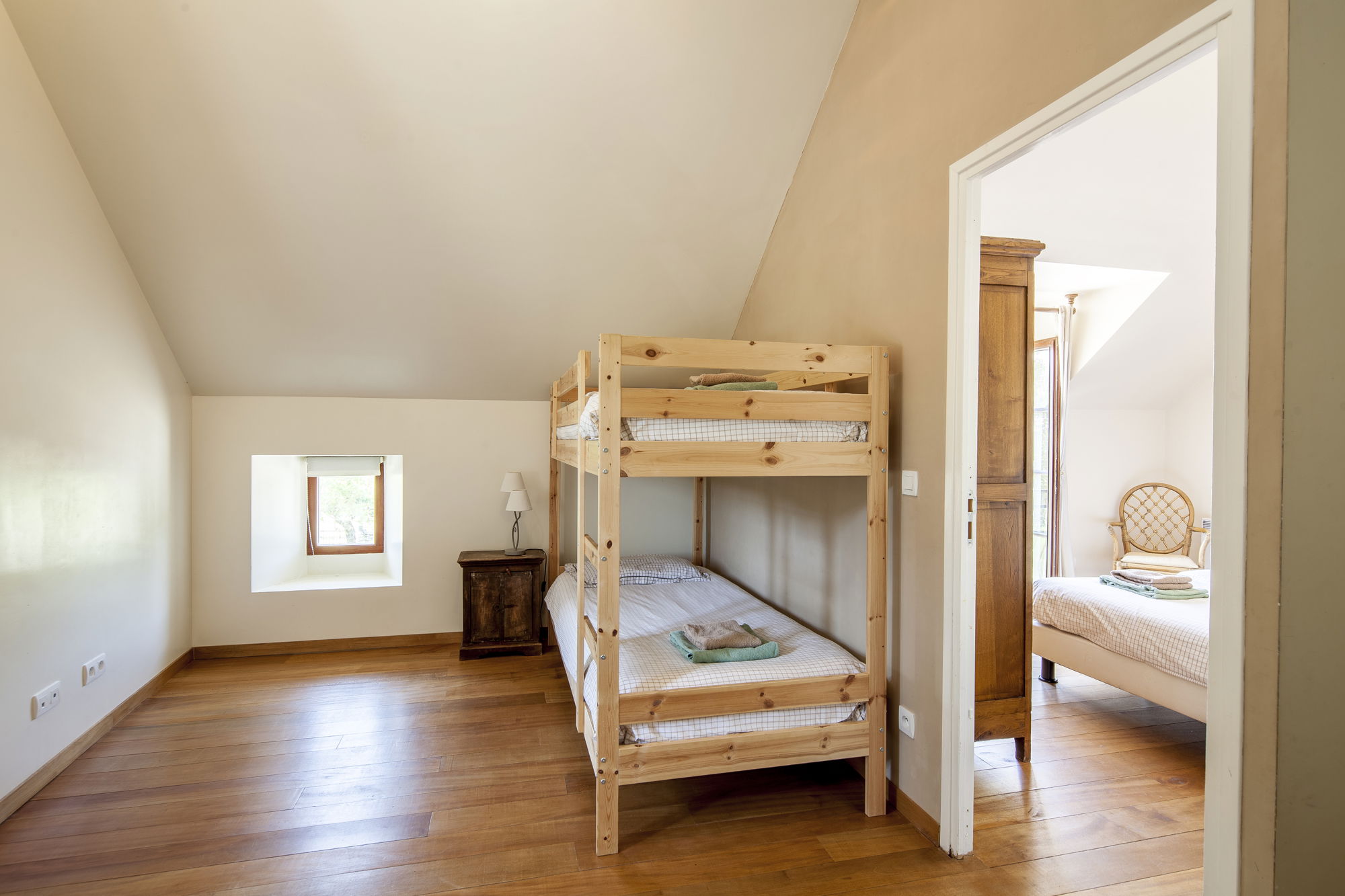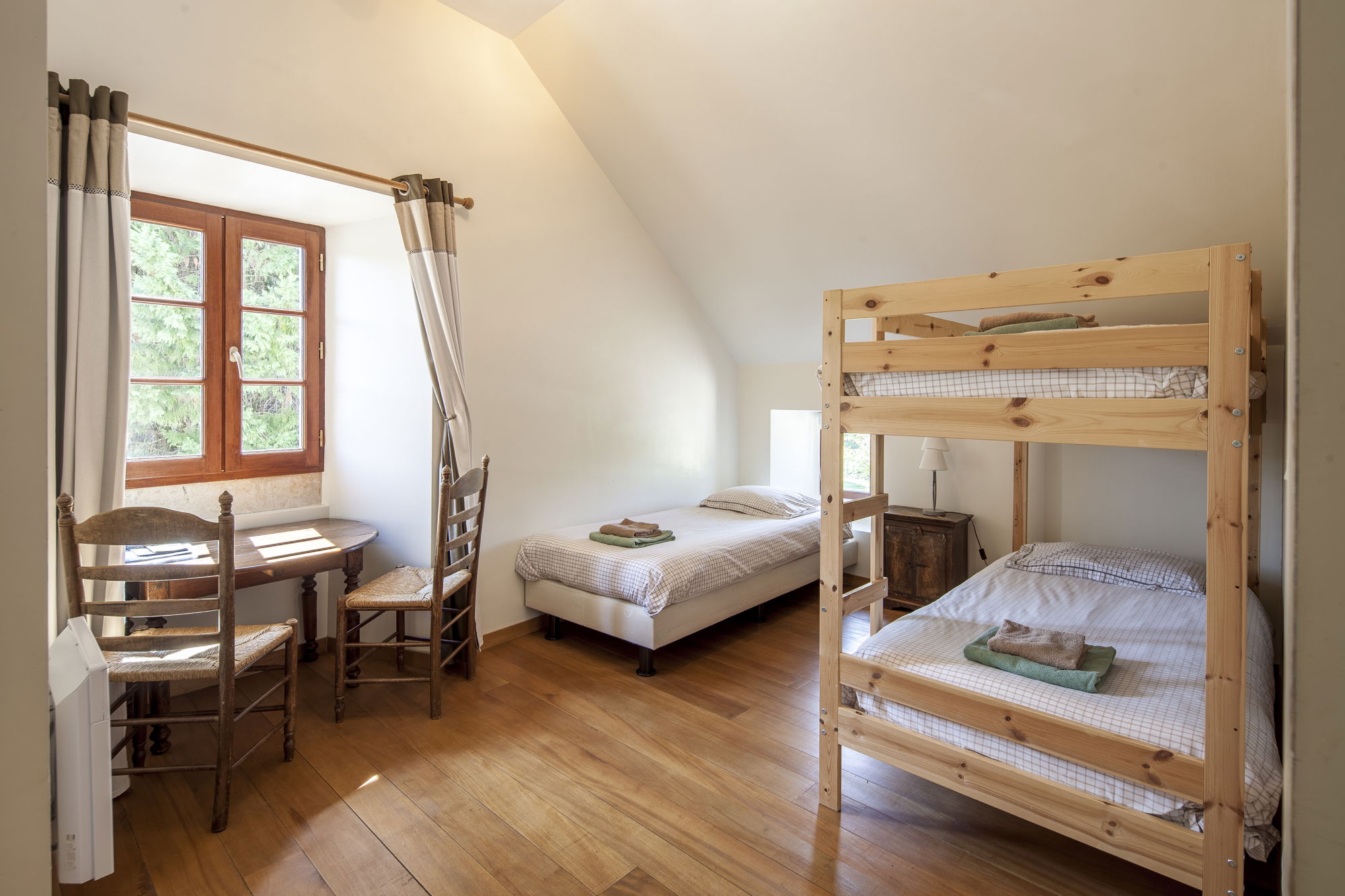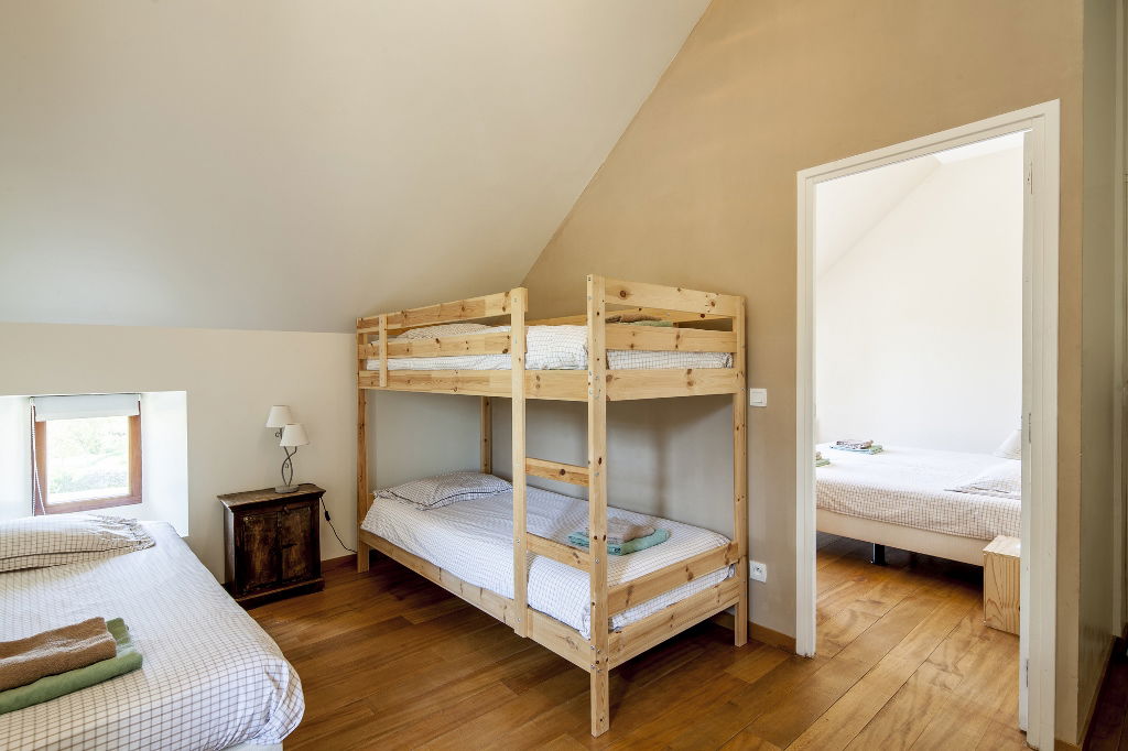 Cette chambre acceuille 4-5 personnes et se trouve sur le premier étage de notre grange aménagé, situé directement à côté de notre maison. Cette chambre familiale spacieuse de 32 m² se compose d’un coin chambre/salon et d’une chambre séparée avec un petit balcon français. De là, vous avez une vue magnifique sur notre propriété et les collines du Lot. Les dimensions des lits sont de 90 x 200 cm. La salle de bain, avec baignoire et douche séparée, a été nouvellement installée.